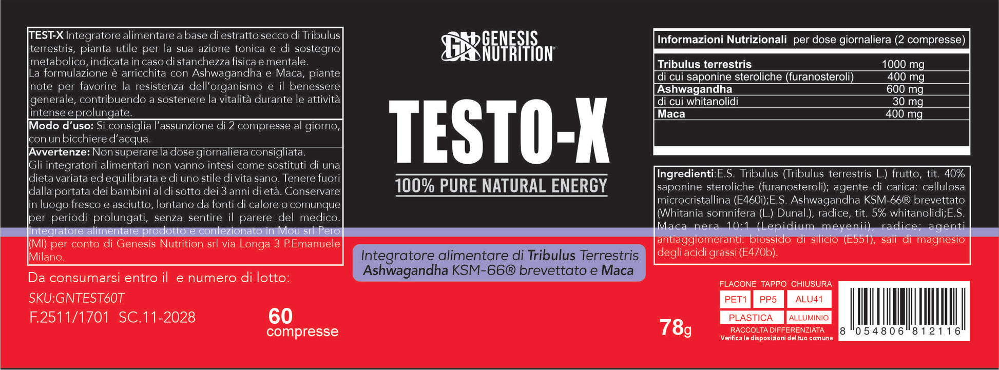 TESTO-X è il nuovo integratore firmato Genesis Nutrition, pensato per aumentare vitalità, forza e benessere ormonale in modo completamente naturale. Una formula avanzata che combina Tribulus Terrestris, Ashwagandha KSM-66® e Maca per supportare energia, performance e resistenza mentale e fisica.